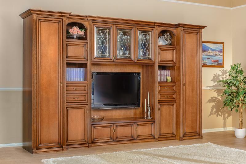 Вручную нанесена коричневая патина, которая придает благородный вид изделию, вызывает эффект старения древесины, а также выделяет четкие границы и контуры фасадов. В завершении детали покрыты итальянским лаком, что обеспечивает блеск и защищает от внешних механических воздействий.