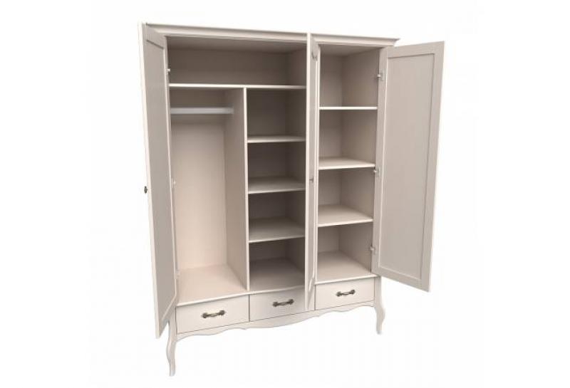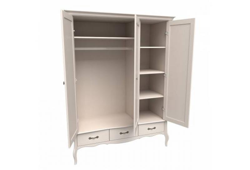 Шкаф имеет два отделения, правое узкое отделение с полками, левое широкое с полкой и штангой для одежды. Три ящика на направляющих Blum с доводчиками. Возможна установка дополнительных полок и ящиков для белья (приобретаются отдельно).