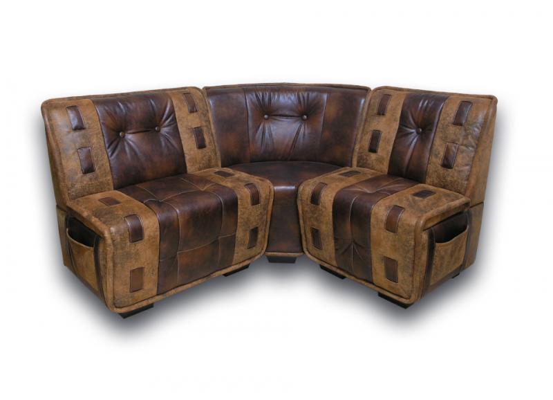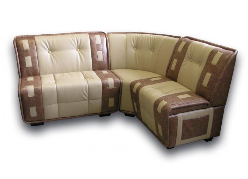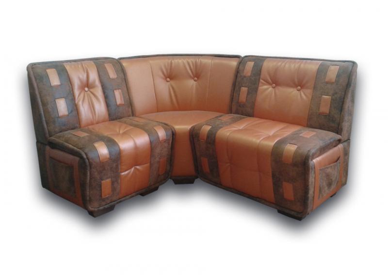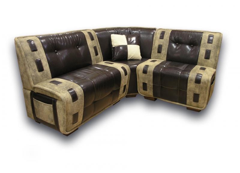 Выполненная в классическом стиле модель дополнена оригинальной деталью – карманами, расположенными по бокам. Они очень удобны для хранения различных мелочей, так, в них можно оставлять газеты и журналы. Кроме того, диваны имеют ящики для кухонной утвари. По желанию клиента уголок можно дополнить столиком, табуретом либо пуфиком.