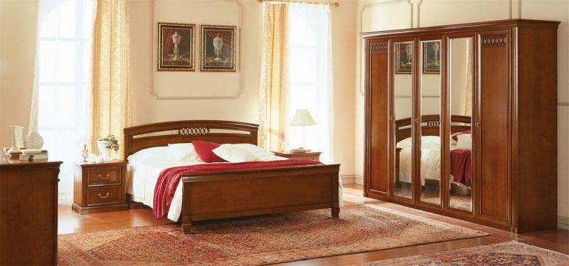 Итальянская мебель для спальни Венеция облицованная шпоном вишни с профилями и рамками из массива, отличается скромным изяществом. Утончённые закруглённые резьбы украшают простые формы элементов, придавая спальне Venezia изысканное очарование.