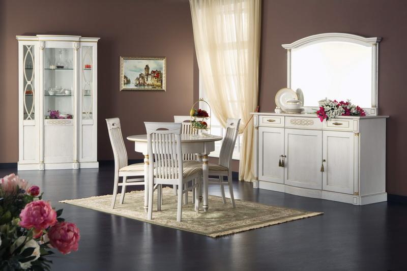 Набор серии «Элеганца» для общей комнаты – красивая, изящная и в то же время многофункциональная и вместительная система хранения, образующая гармоничный и самодостаточный мебельный ансамбль. Базовая комплектация набора состоит из шкафов для посуды (прямого и углового), тумбы общего назначения и зеркала в полукруглом обрамлении. Для гостиной предусмотрена и обеденная группа, выполненная в едином стиле и цвете с другими предметами обстановки. Дополнят интерьер, сделают его более уютным, миниатюрная жардиньерка и удобная (одно- и двухместная) банкетка.